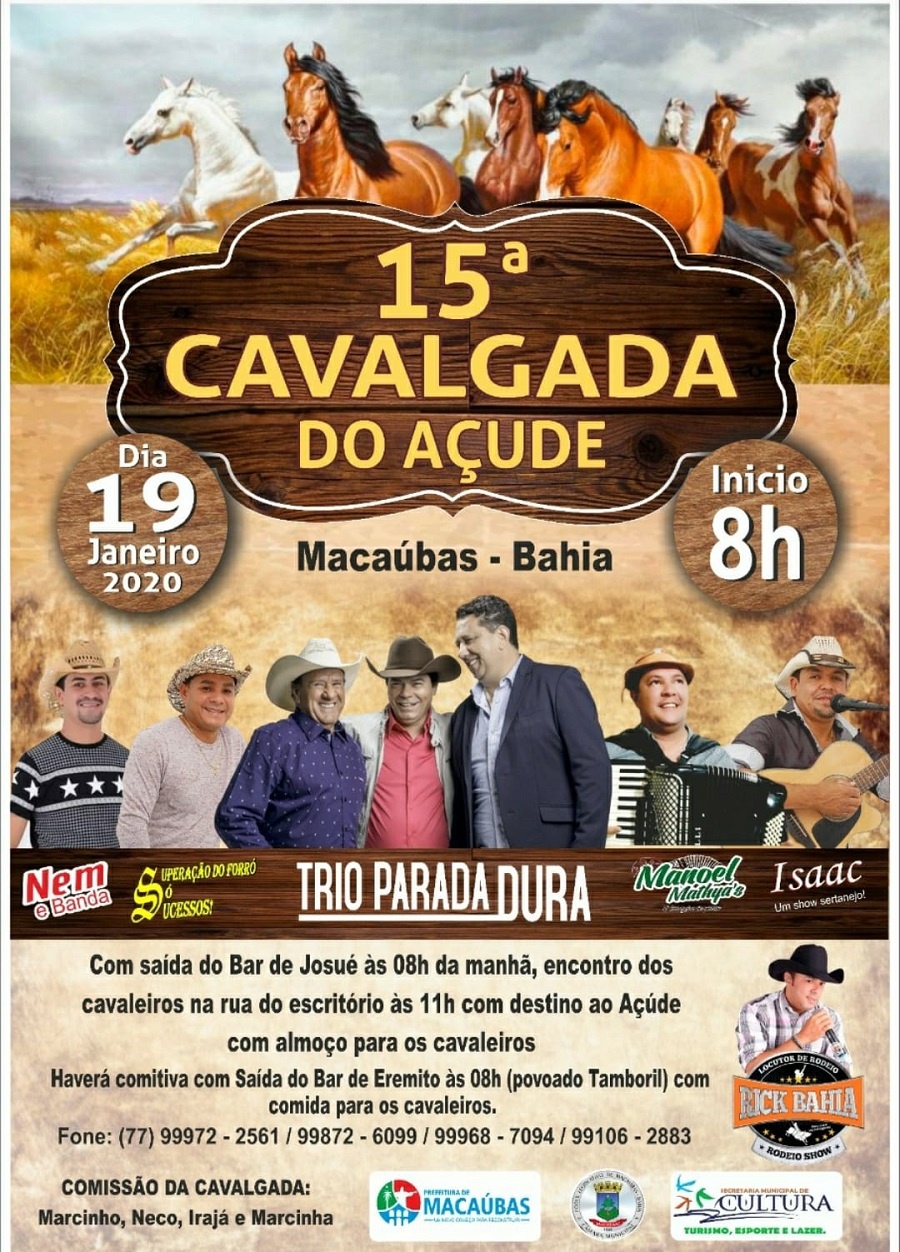 A 15ª edição da Cavalgada do Açude será neste domingo, 19 de janeiro de 2020, além da Tradicional Cavalgada saindo do Bar de Eremito (Povoado de Tamboril) até o Distrito do Açude, o evento contará com várias apresentações musicais, entre elas: TRIO PARADA DURA, Superação do Forró, Nem e Banda, Manoel Mathias e Isaac de Macaúbas. A Comissão Organizadora está preparando mais um grande evento e todos estão convidados.